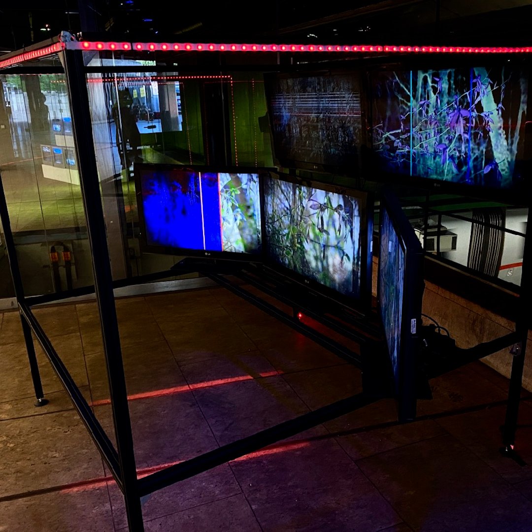 Trains, buses, cars, bicycles and pedestrians meet over several levels at one of Vienna’s busiest transport hubs. In addition, trees, meadows, flower beds and bodies of water invite you to linger, rest and dream. The contrast between urban movement and the relaxing power of nature can hardly be greater than in this place. Video loops on spatially arranged screens and a slowly running light sequence pick up on these opposites and continue them reflected in the showroom. Vehicles move through the city in patterns that always appear to be the same, along lanes and lane markings. Bushes and trees, in turn, create counterpoints in the visual composition. A red line not only leads through the underpass, it also connects the street with a virtual undergrowth in which a stylized jungle also dissolves into shapes and structures. The question of a confrontation between the challenges of traffic in the urban environment and nature itself, as a synonym for a possible different way to each other, is discussed and negotiated aesthetically in this work. However, it is not about presenting a simplified position on either city or country, on traffic or forest, but about presenting what connects and complements each other.
